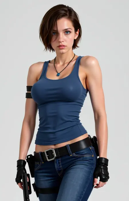 photo realistic, realistic, fluxjillvalentine, solo, brown hair, gloves, fingerless gloves, short hair, blue eyes, boots, tank top, jewelry, full body, pants, lips, necklace, blue tank top, nose, standing, belt, black gloves, breasts, brown pants, looking at viewer, black footwear, bare shoulders, leafs, burry background, sunlight, back lighting