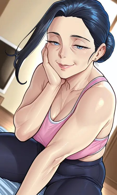 rachaelarkv, mature female, wrinkles, 1girl, side layered cut, single hair bun, updo, black hair, sports bra, pants, yoga pants,