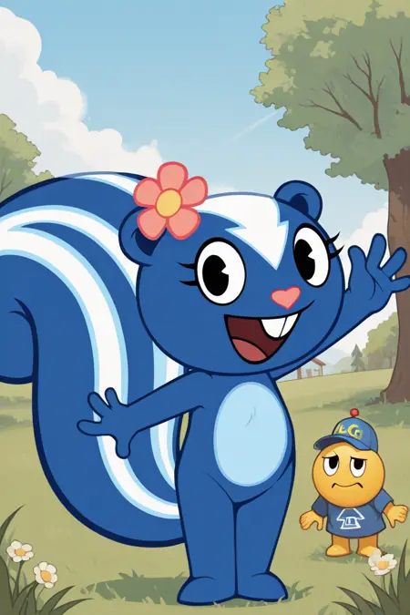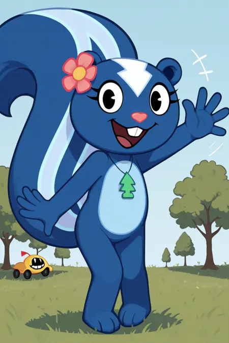 提示词:petunia \(htf\),臭鼬,臭鼬耳朵,臭鼬尾巴,头部花朵,项链,空气清新剂,门牙,吃豆人眼睛,心形鼻子