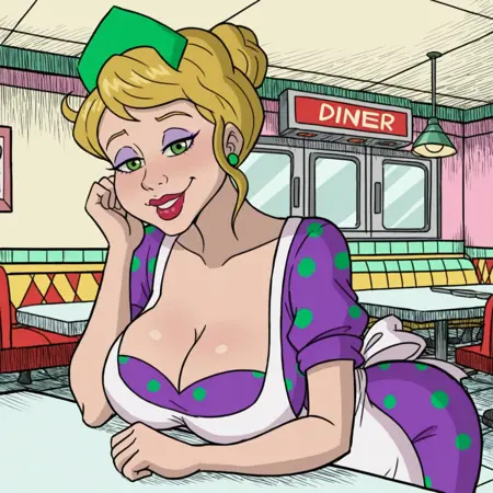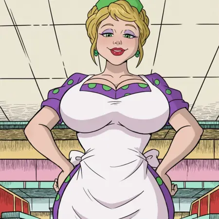 | 训练词汇 | thewaitressgwtk, mature female, large breasts, blonde hair with rear upper bun, green eyes, rose red lipstick, purple eyeshadow, thick lips, green earrings, short sleeve purple dress with green polka dots, white apron, green waitress hat, cleavage, purple highheels已复制! |