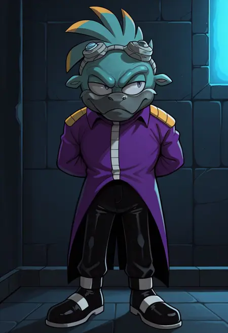 Bill Platypus, cyan skin, dark gray beak, dark blue eyes, gray goggles on head, purple coat, black pants, white gloves, black shoes