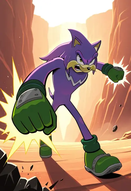 Thrash the Tasmanian Devil, purple fur, yellow eyes, gray birthmark in chest, green gloves, green shoes