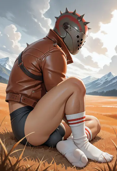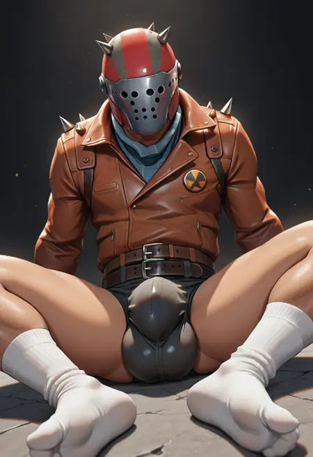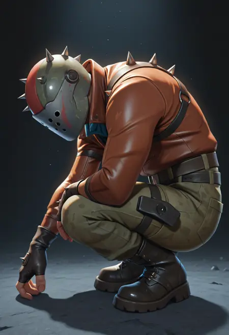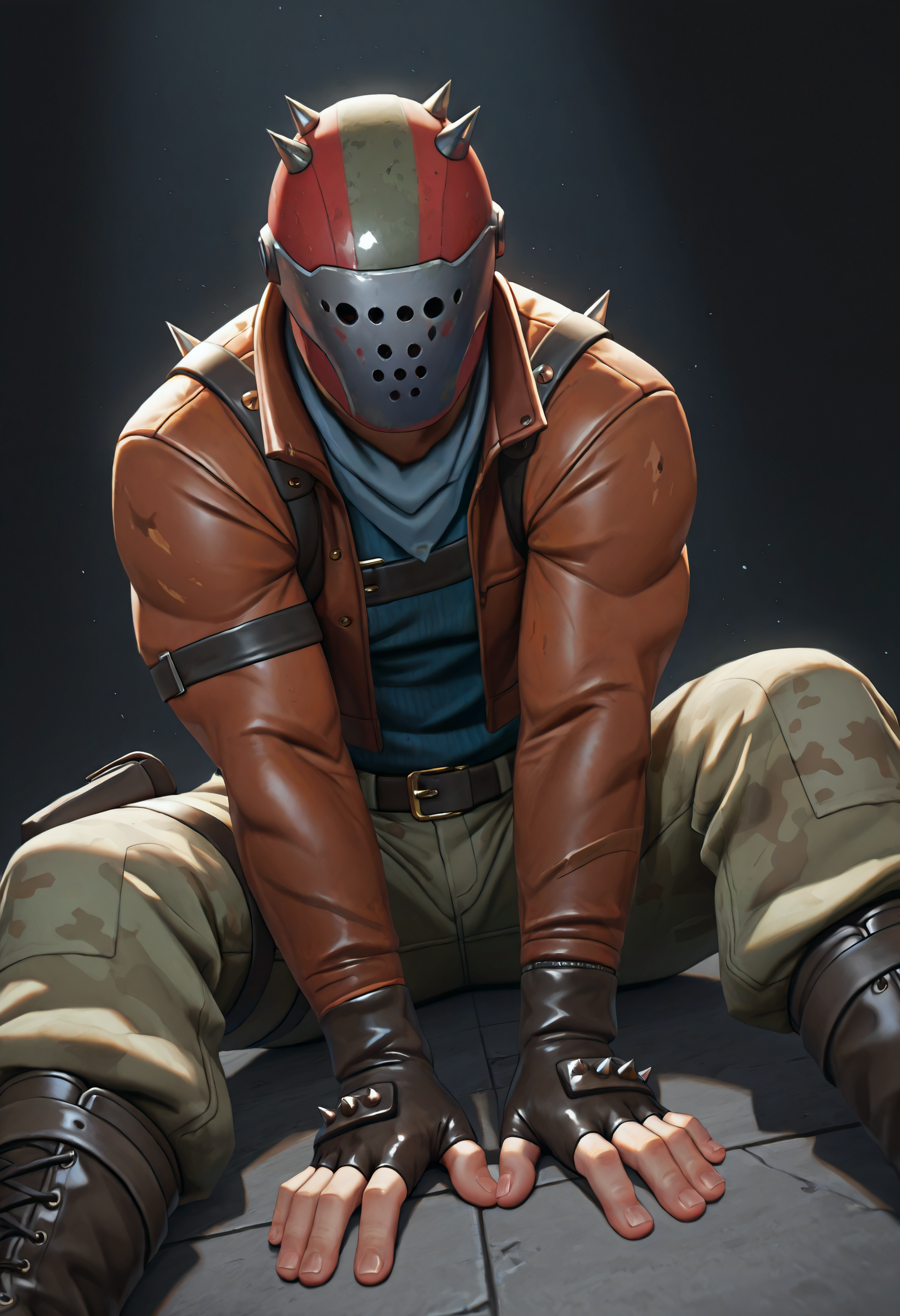 Optional Trigger words: leather jacket, raised collar, shoulder spikes, fingerless studded gloves, wrist bracer, camo cargo pants with straps, heavy strapped combat boots,