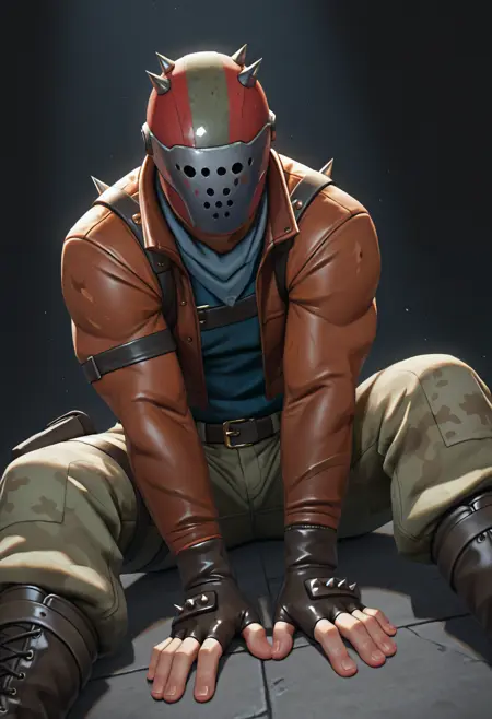 선택적 트리거 단어: 가죽 재킷, 올라간 칼라, 어깨 날카로운 돌기, 손가락 없는 스파이크 장갑, 손목 보호대, 스트랩이 달린 카모 커고 팬츠, 무거운 스트랩 전투 부츠,