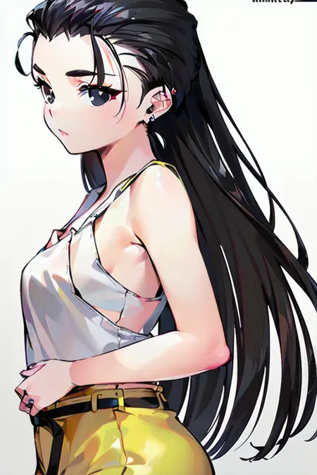 lora:super_oume_otane-04:0.9(黑眼睛,白色背心:2)(头发向后梳,黑发,非常长的头发,直发:1.5),凉鞋,(白色腰带,黄色裤子:1.5)