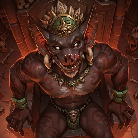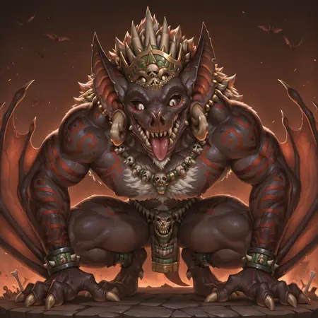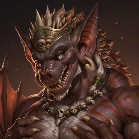 标签:蝙蝠、毛茸茸的雄性、怪物、珠宝、阿兹特克主题、尖牙、骨制耳环、臂展翅膀、黑色巩膜、装饰性腰布、绿色手镯、红色纹身、白发、项链、白色眼睛、王冠