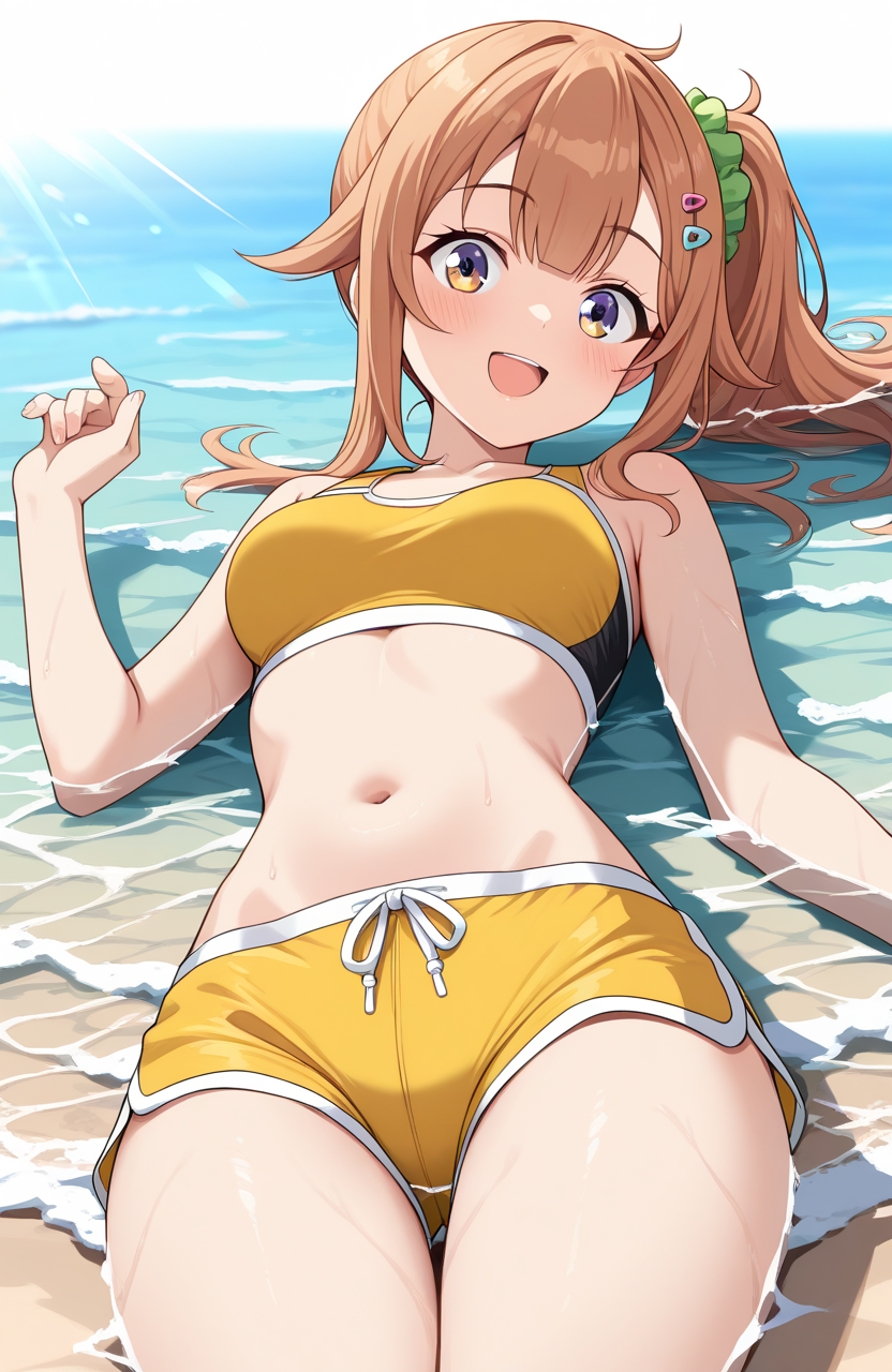 아우트핏 9 (해변): shibeach, 노랑 비키니, 흰 띠가 달린 탱키니, 노랑 탱키니, 흰 테두리가 있는 노랑 반바지, 리본 매듭