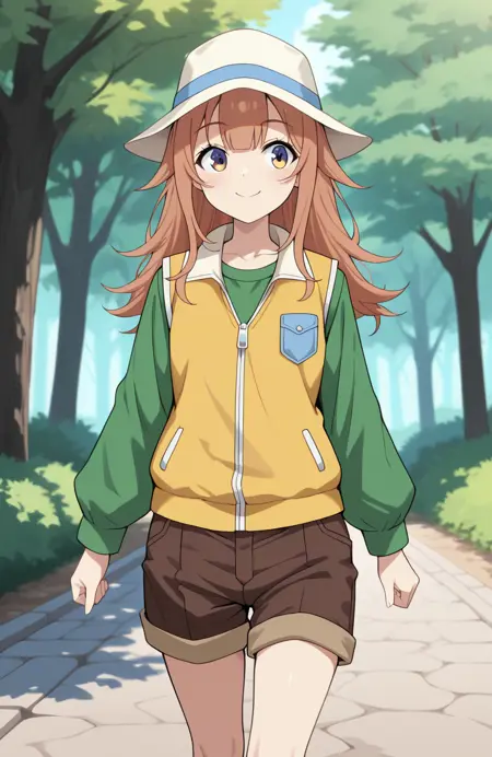 아우트핏 6 (등산): shihike, 모자, 단일 파란 가슴 주머니, 흰 지퍼가 달린 노랑 조끼, 녹색 셔츠, 긴 소매, 갈색 반바지