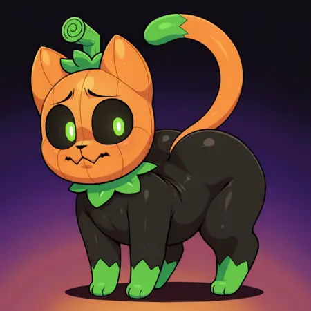 1boy, male, furry, feral, quadruped, feline, cat, solo, black body, pumpkin-shaped head, black sclera, green eyes, black nose, cat ears, green neck tuft, green paws, orange pawpads, tail, dipstick tai