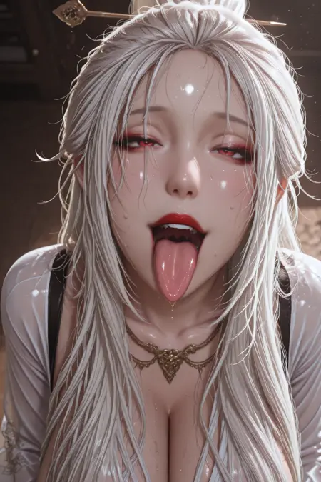 1girl, solo, wuxia, 성숙한 여성, 매우 긴 머리, 흰 머리, 반짜린 스타일, 머리장식, 머리핀, 황금 머리핀, 긴 앞머리, 갈라진 앞머리, 머리카락, 눈 위의 머리카락, 가슴 위의 머리카락, 어깨 위의 머리카락, 창백한 피부, 붉은 눈, 긴 속눈썹, 아이라이너, 붉은 립스틱, 두꺼운 입술, 메이크업, 디테일한 눈