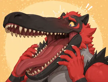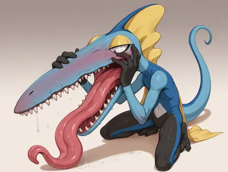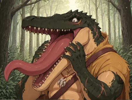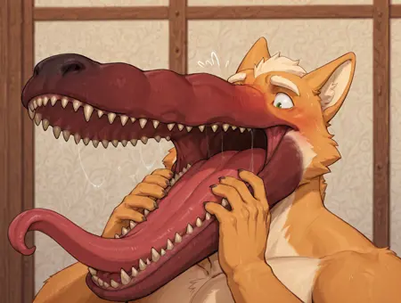 Use this Lora to give characters longer mouths with big 'ol tongues. Works best with furries, but can work with humans, though it will likely switch the mouth to something more dinosaur-esque. Activation tag is (big mouth), but adding things like (long mouth) or (long snout) will help. Closed mouth images are possible but difficult as it tends to make them open most of the time.