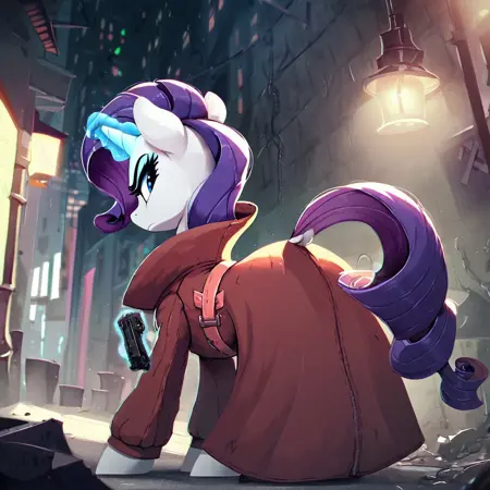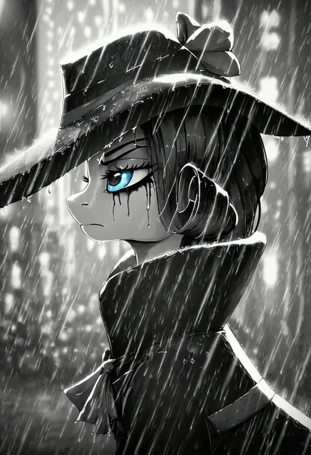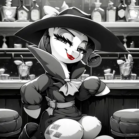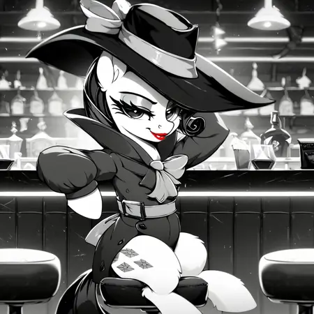 All it seems to need is "Rarity" obviously, and "trench coat" it you want the coat and leaving off "detective hat" will remove the hat. I've also got it to use "magic aura" to hold objects for the most part but it can be iffy. Add "monochrome" for the noir aesthetic and "blue eyes" or "red lipstick" if you want either of those in color while in noir mode.