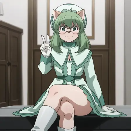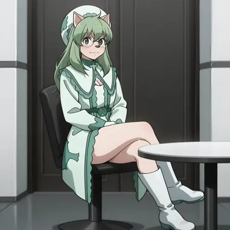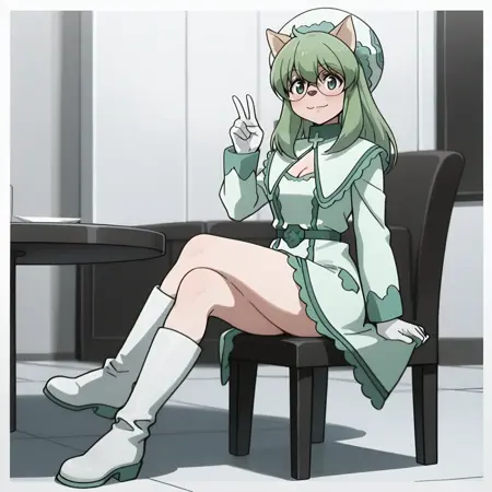 TAGS: green hair, shoulder-length hair, green eyes, glasses, animal features, dog ears, dog nose, animal nose, hat, light green coat, long coat, frills, wide collar, long sleeves, green belt, bow belt, white gloves, white boots, cross ornament
