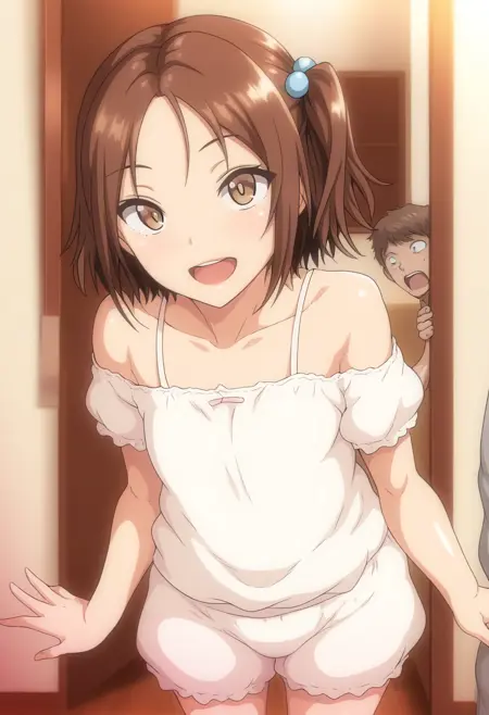 rikaa, 1girl, brown hair, short hair, one side up, hair bobbles, hair ornament, brown eyes, bare shoulders, off shoulder, bloomers, underwear, standing, looking at viewer, smile, open mouth, solo, solo focus, indoors