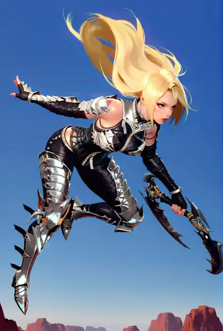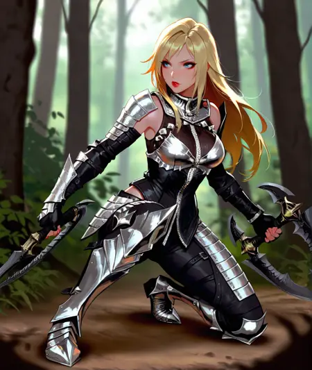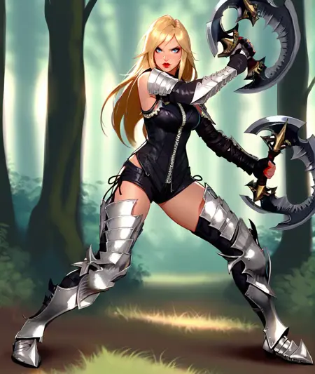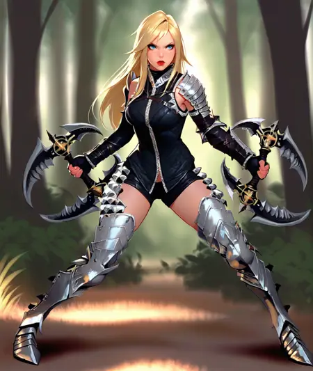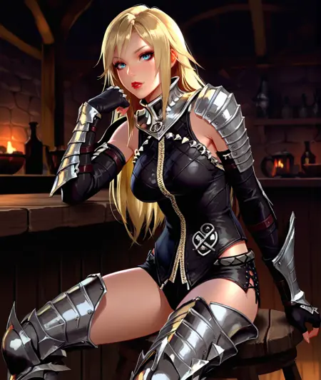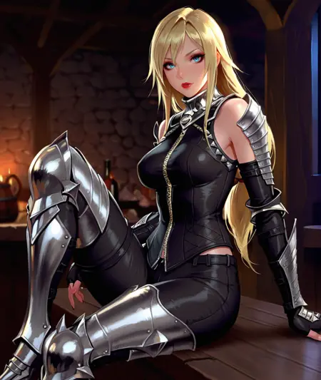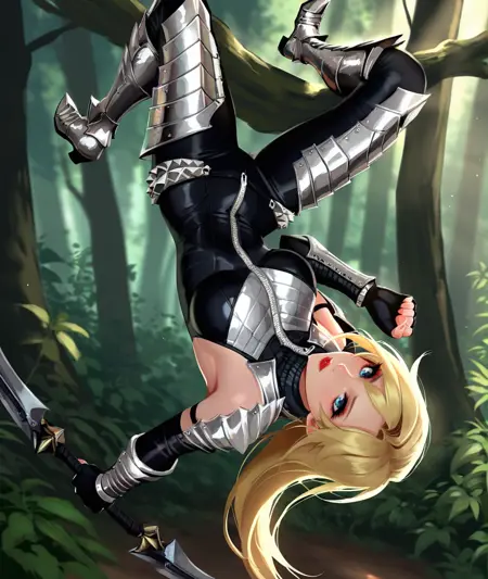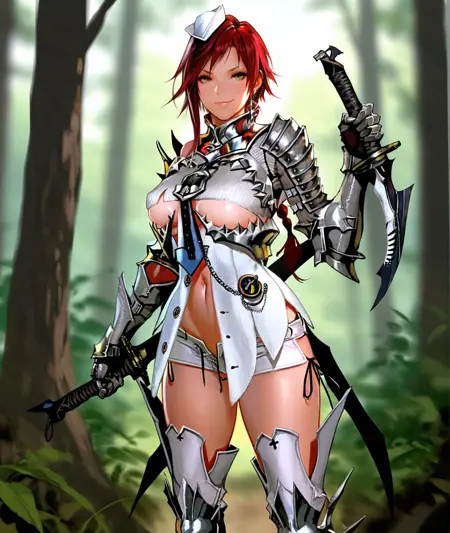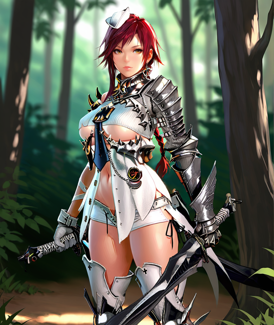 허벅지 긴 양말, 모자, 배꼽, 허벅지, 귀걸이, 부츠, 검, 갑옷, 입술, 짧은 반바지, 한 줄 땋은 머리, 아랫가슴, 허벅지 부츠, 장갑, 검집, 양손 무기, 정강이 보호대, 장갑, 보석, 어깨 갑옷, 어깨 보호대