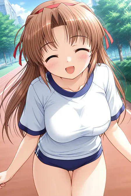 체육복, 빨간 머리띠, 흰 셔츠, 티셔츠, 열쇠뼈, 짧은 소매, 파란색 부루마, 가까움