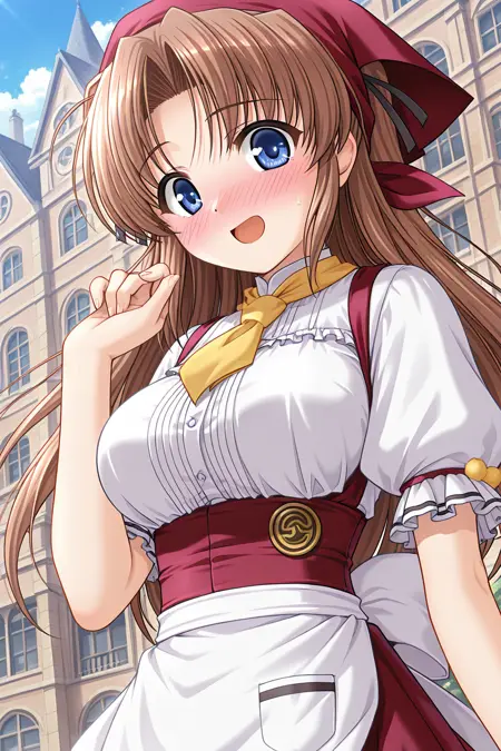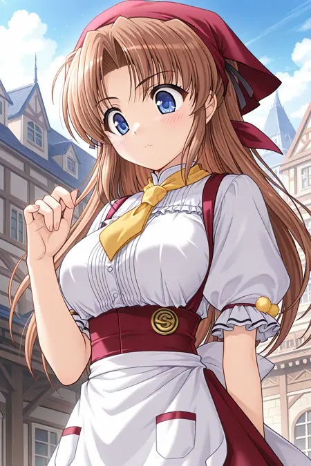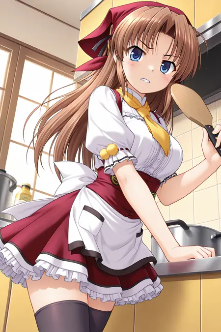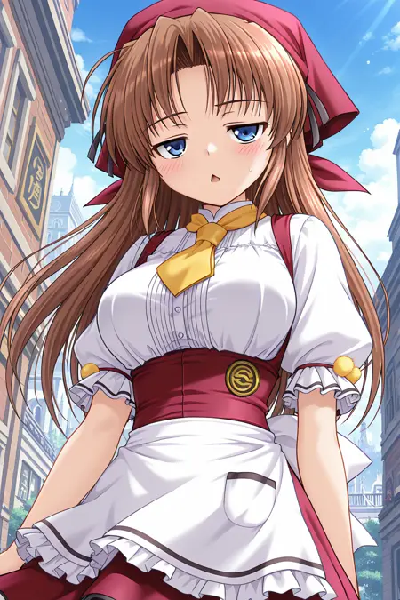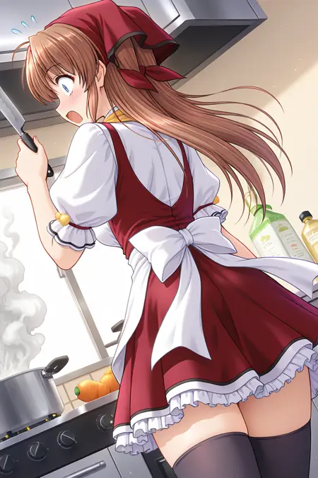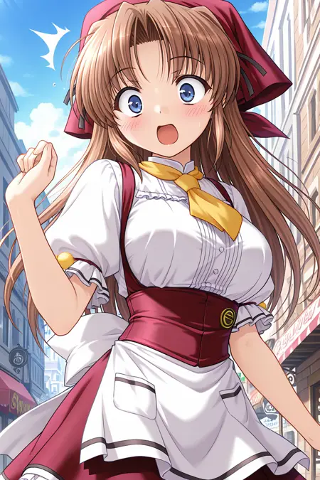 웨이트리스, 머리수건, 빨간 수건, 반바지 수건, 빨간 드레스, 노랑 넥타이, 앞치마 드레스, 흰 셔츠, 중앙 프릴, 볼륨 있는 짧은 소매, 프릴 소매, 폼퐁, 팔 리본, 허리 앞치마, 흰 앞치마, 주머니, 배지, 뒤쪽 활, 흰 활, 미니스커트, 프릴 스커트, 페티코트, 젯타이 루이키, 검은 허벅지 양말, 메리제인 신발,
