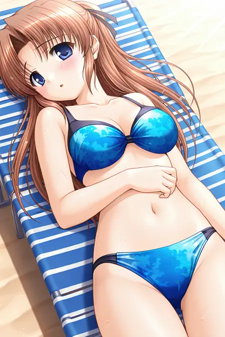 수영복, 파란색 비키니, 프린트 비키니, 바다 무늬, 열쇠뼈, 가슴 선, 배꼽,