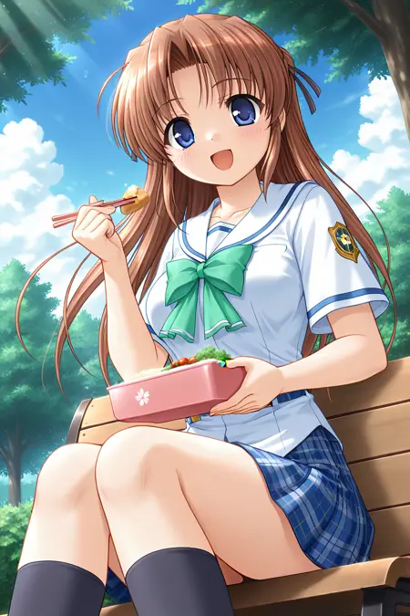 학교 복장, 세라후쿠, 흰 해군 칼라, 녹색 넥타이, 열쇠뼈, 흰 셔츠, 바깥으로 덜어낸 셔츠, 짧은 소매, 파란색 줄무늬, 파란색 벨트, 파란색 스커트, 미니스커트, 체크 무늬 스커트, 주름 스커트, 양말, 무릎높이 양말, 검은 양말,