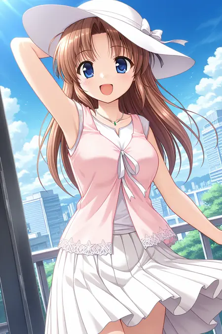 블라우스, 흰 셔츠, 소매 없는 셔츠, 레이어드 셔츠, 분홍색 조끼, 열린 조끼, 목걸이, 열쇠뼈, 팔 노출, 흰 리본, 흰 스커트, 긴 스커트, 주름 스커트, 핀치 주름 스커트,