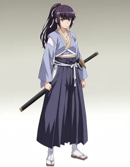 mai_sh,m_kojuurouta,solo,ponytail,purple_eyes,long_hair,long_sleeves,purple_hair,serious,black_hair,japanese_clothes,blue_clothes,yellow_colla,hakama,hakama_skirt,sheathed