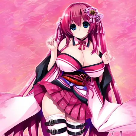 red hair, very long hair, bangs, hair between eyes, hair flower, blue eyes, huge breasts,