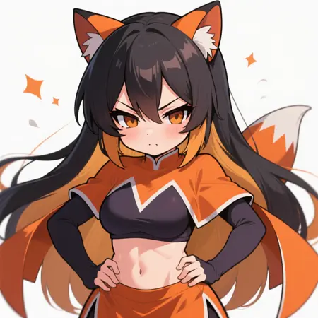 The classic costume is "dark crop top, orange capelet" if it doesn't appear by itself