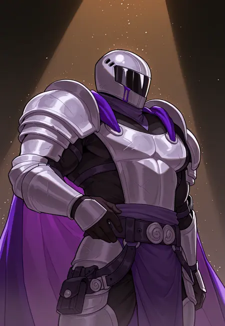 갑옷, 보라색 망토, 장식용 벨트, 어깨 보호대, 보라색 넥커치프, 검정색 터틀넥, 검정장갑,