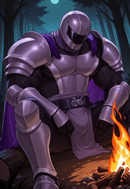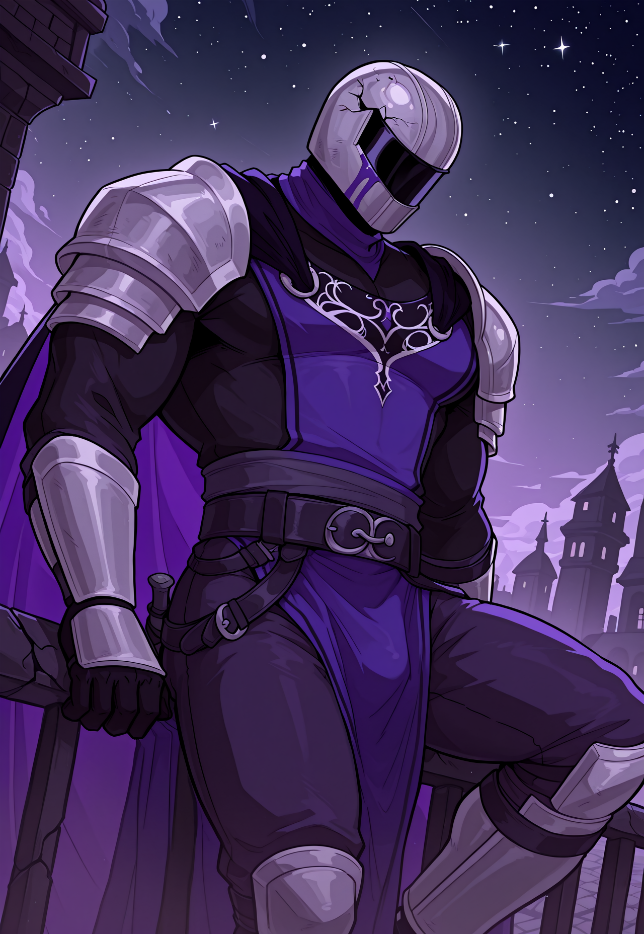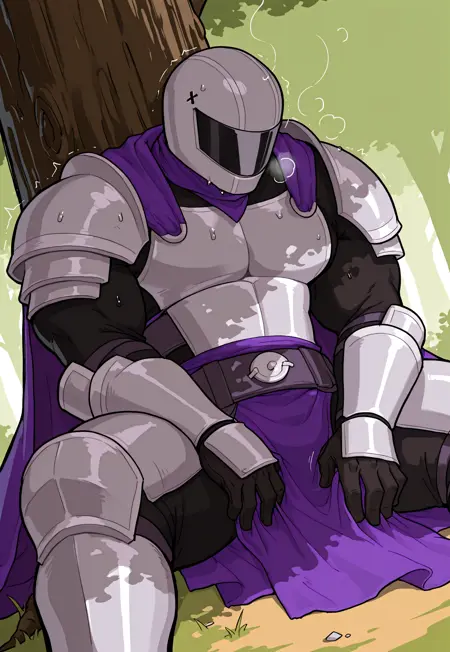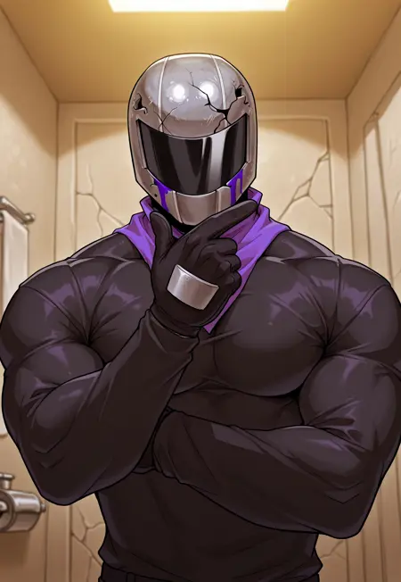 SirKnight, , 페이스시ール드가 달린 헬멧, (헬멧에 균열), (헬멧에 보라색 반점), (눈과 입 없음)