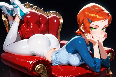 グウェンのプロンプト:1girl、ほくろ、短髪、オレンジ髪、緑目、中程度の胸、広い腰、引き締まった体、太ももが太め、引き締まった脚