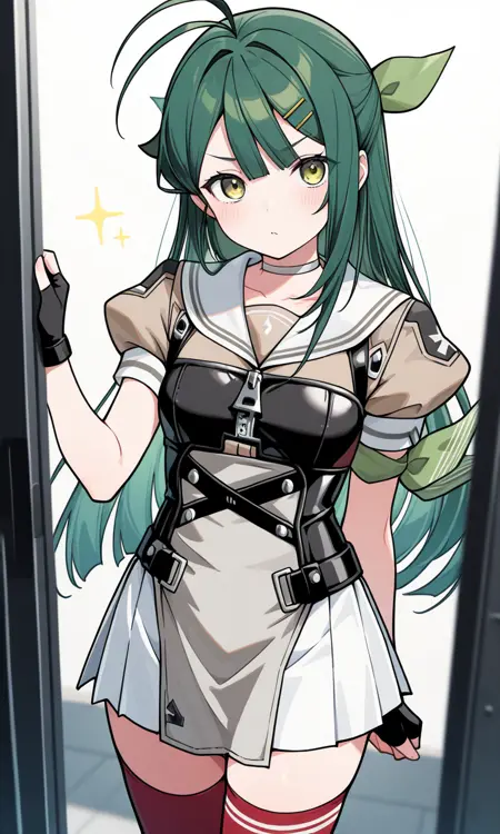 Default Outfit : sugiKC, long hair,dark green hair, hair ornament, hair ribbon, hairclip, antenna hair, ahoge, pleated skirt, black gloves, choker, white skirt, miniskirt, fingerless gloves, puffy short sleeves, white sailor collar,red thighhighs, green ribbon,grey_pelvic_curtain,brown shirt,black corset,zipper pull tab,