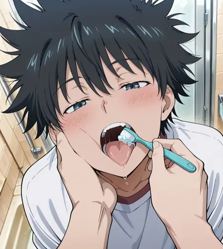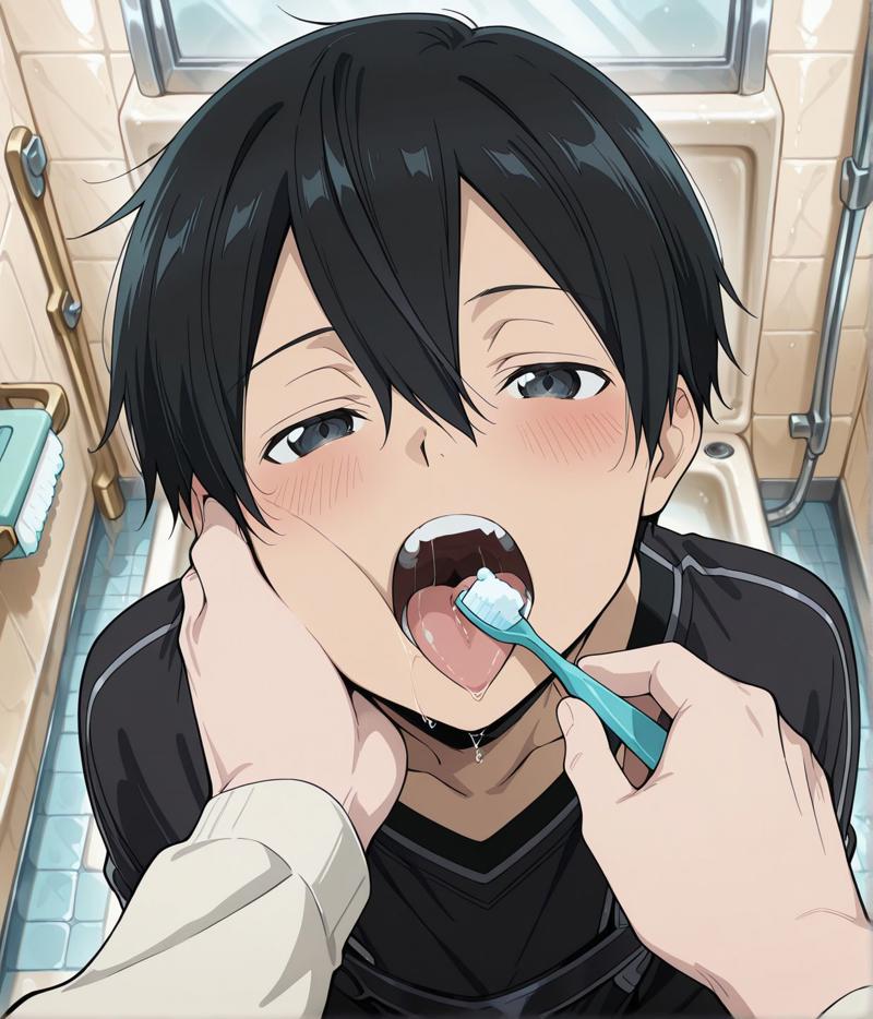 1boy,male focus, brushing another's teeth, blush, open mouth, solo focus,