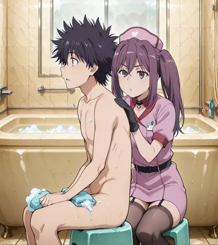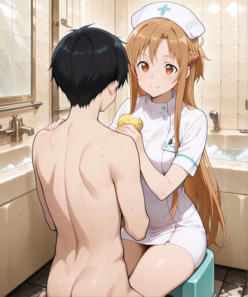 1girl,1boy,hetero, girl help boy bathe,help wash boy’s body,