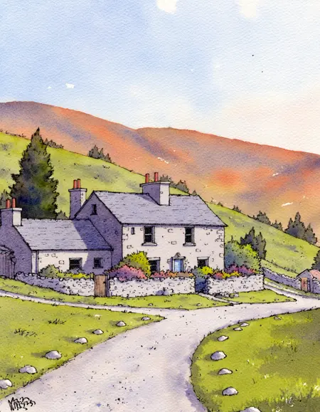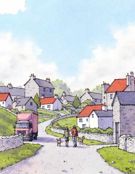'your-prompt'画作以 matty-burnham 风格绘制的一幅画:一位身穿红色外套和棕色靴子的女性,牵着一只狗,走在一条两旁排列着白色建筑的宁静街道上,建筑配有蓝色百叶窗和橙色屋顶,天空湛蓝,鹅卵石小径旁摆放着盆栽植物,增添了一抹绿色