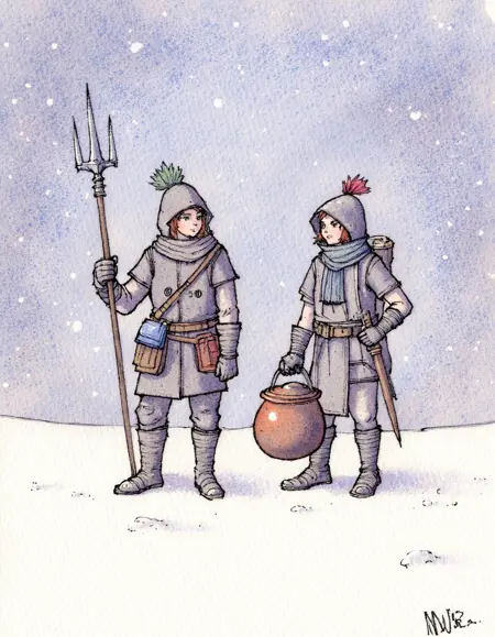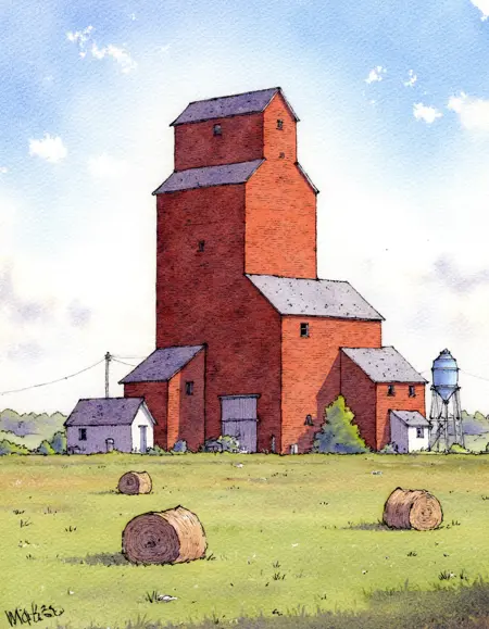 以 matty-burnham 风格绘制的一幅画:一位身穿黄色外套的小个子男子,行走在被一座高耸的红色建筑主导的雪景中,周围是较小的棕色和灰色建筑,头顶是宁静的白色天空,捕捉了红色与周围沉稳色调之间鲜明的对比
