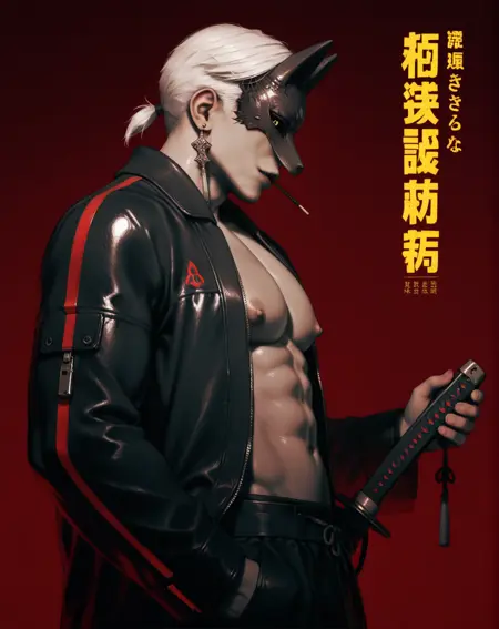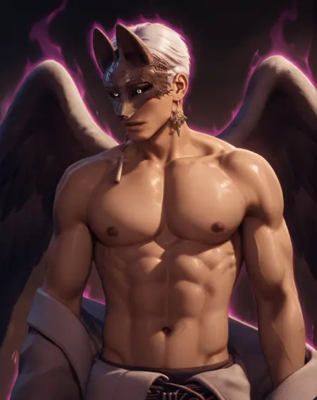 Kitsune(SHF), 1boy, male focus, solo, white hair, short ponytail, earrings, jewelry, fox mask, black sclera, yellow eyes, japanese clothes, kimono,