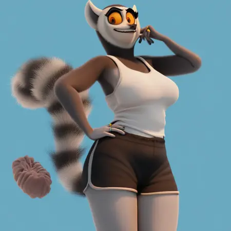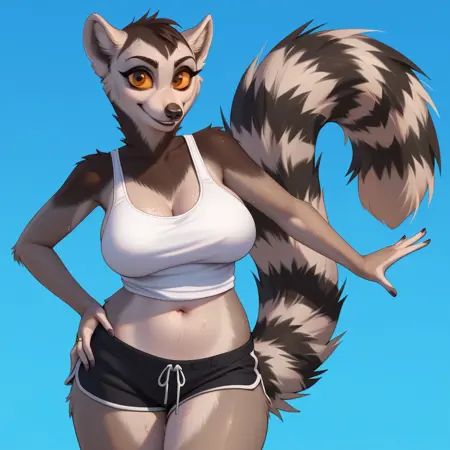 ring-tailed lemur, grey fur, two-tone fur, black pupils, orange sclera, pointed ears, black nose, striped tail, prehensile feet, hat,