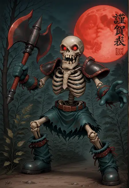 skeleton, (alien skull:1.2), animal skull, brain tumor, swollen skull, dented skull, bulging skull, (single horn), horn crest, nose horn, nasal crest, symmetrical skull, bald, long skull, long head, elongated head, skull pauldrons, ribs, legs, feet, glowing eyes, green eyes, round shield, hooked sword,