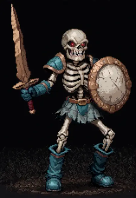 st4lf0s00t, stalfos, skeleton warrior, glowing eyes, red eyes, giant chin, bad teeth, broken teeth, small head, wide shoulders, huge torso, top heavy, big chest, evil skeleton, pauldrons, teal gloves, teal skirt, teal boots, round shield, crooked sword, bronze sword, shield, sword, holding weapon, holding,