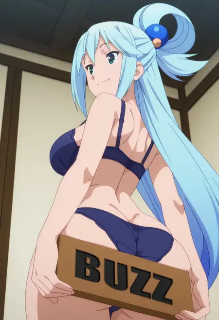 buzz_sign, hands on sign, fingers on sign, fingers, sign under ass, back view, low angle, holding sign, buzz sign, looking at viewer