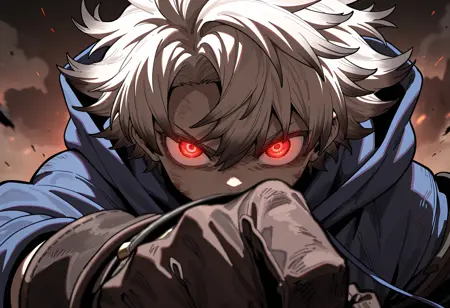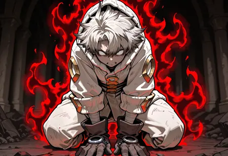Main tags: rudo (gachiakuta), 1boy, red eyes, glowing eyes, white hair, dirty hair tips, brown gloves, metal ring on gloves, red aura, red energy