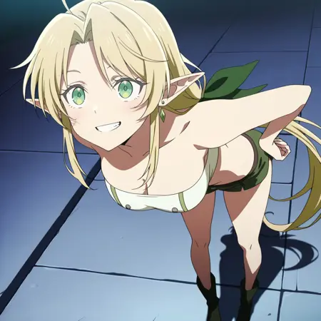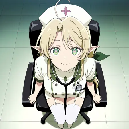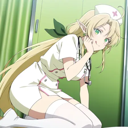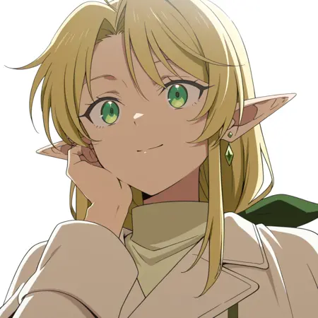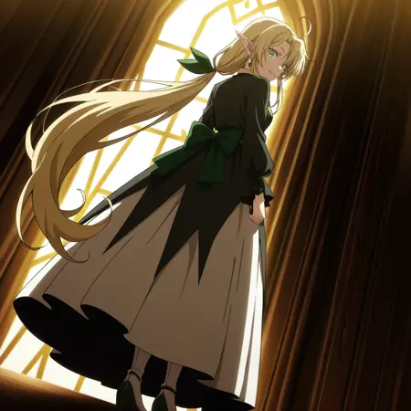 WMSara、緑の目、金髪、とがった耳、エルフ、非常に長い髪、イヤリング、ジュエリー、あほ毛、低めのポニーテール、緑のリボン、髪のリボン、側髪、