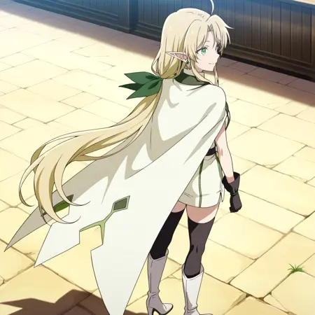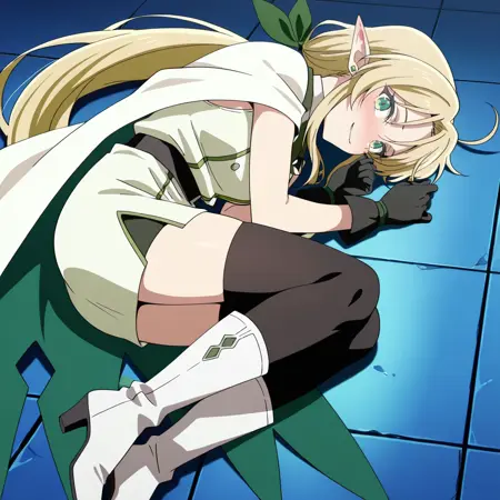 WMSara、緑の目、金髪、とがった耳、エルフ、非常に長い髪、イヤリング、ジュエリー、あほ毛、低めのポニーテール、緑のリボン、髪のリボン、側髪、