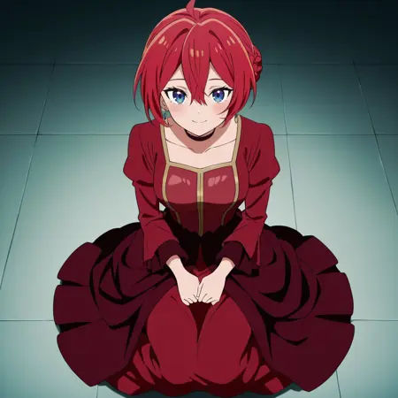 짧은 머리, 검은 목걸이, 귀걸이, 보석, 한 줄기 머리 땋기, 빨간 드레스, 긴 드레스, 긴 소매, 잔골, 풍성한 소매,