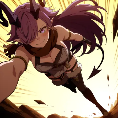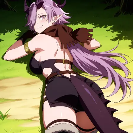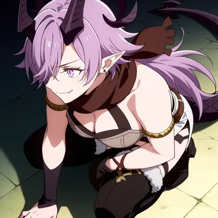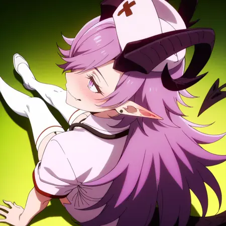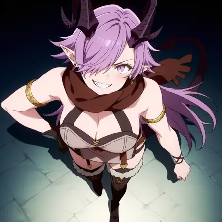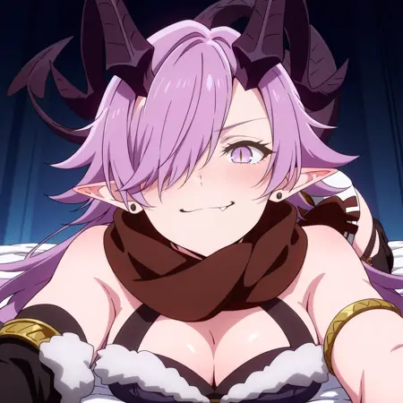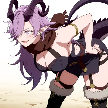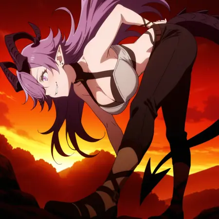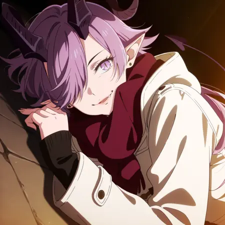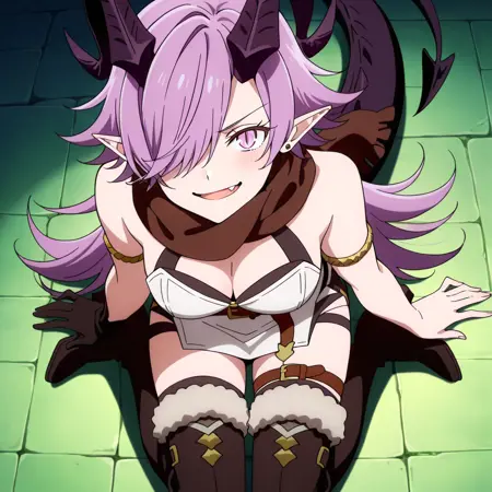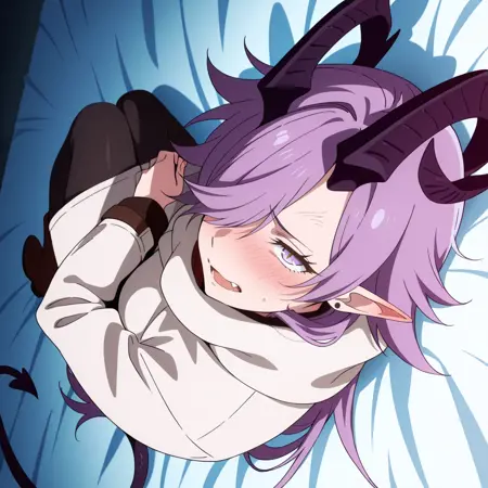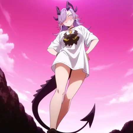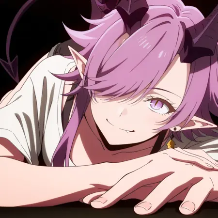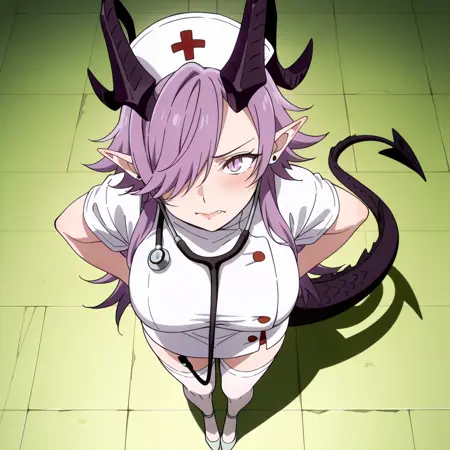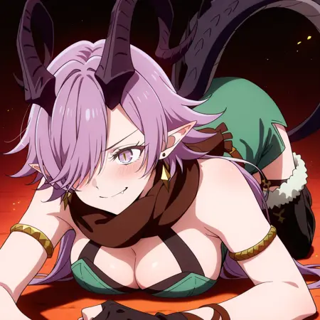 WMLeonore, slit pupils, demon girl, dragon horns, pointy ears, purple eyes, hair over one eye, jewelry, earrings, purple hair, long hair, tail, fang,
