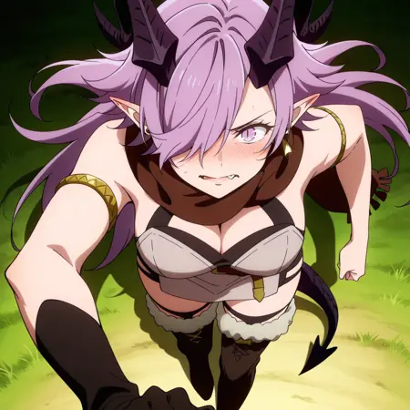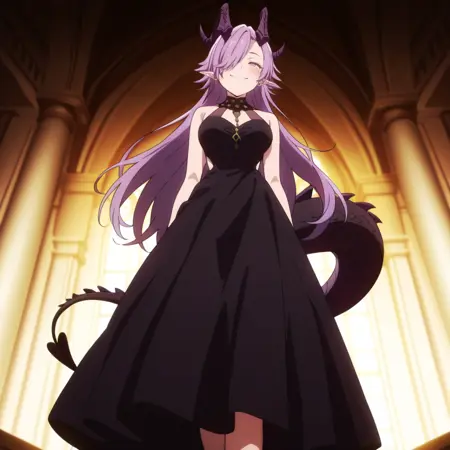 WMLeonore、縦に細長い瞳、悪魔の少女、ドラゴンの角、尖った耳、紫色の目、片方の目に髪がかかる、ジュエリー、イヤリング、紫の髪、長い髪、尾、牙、
