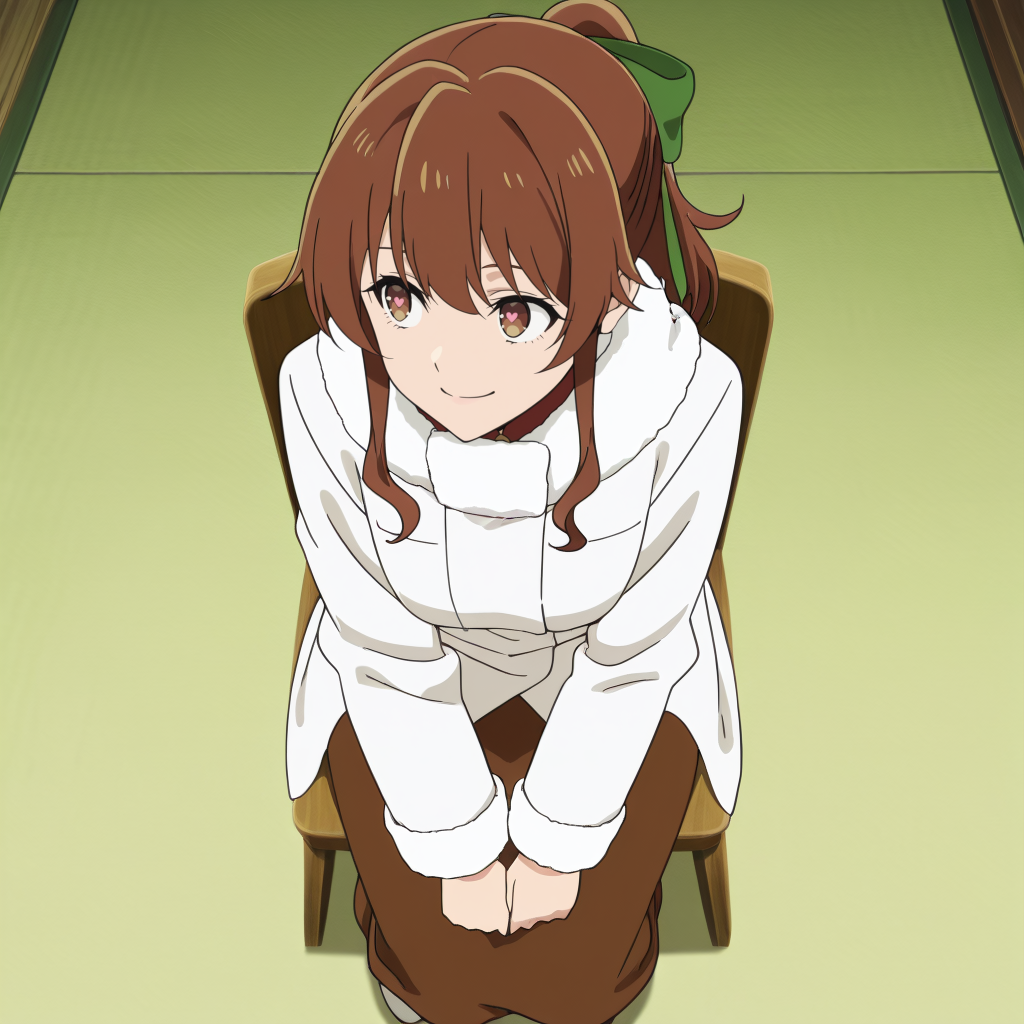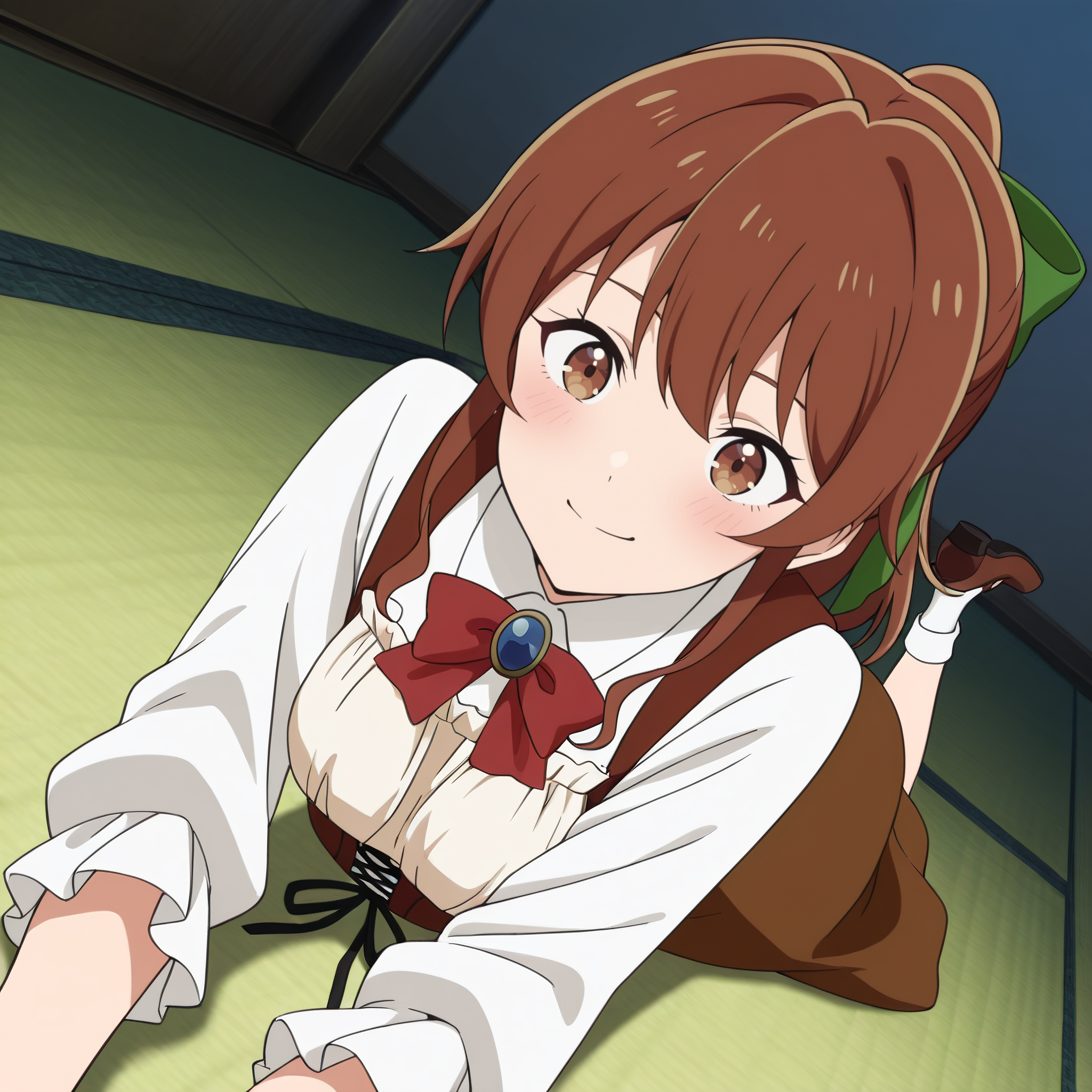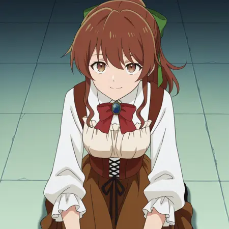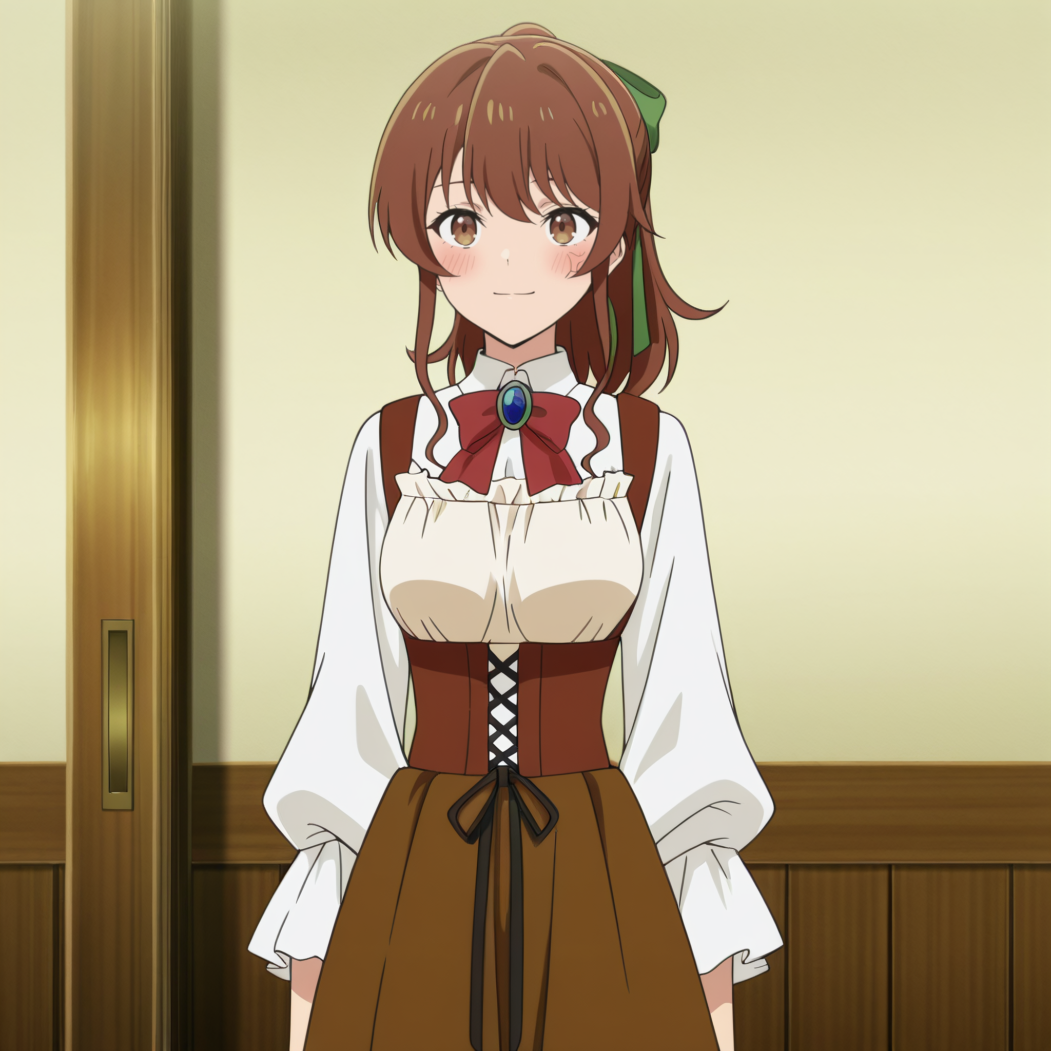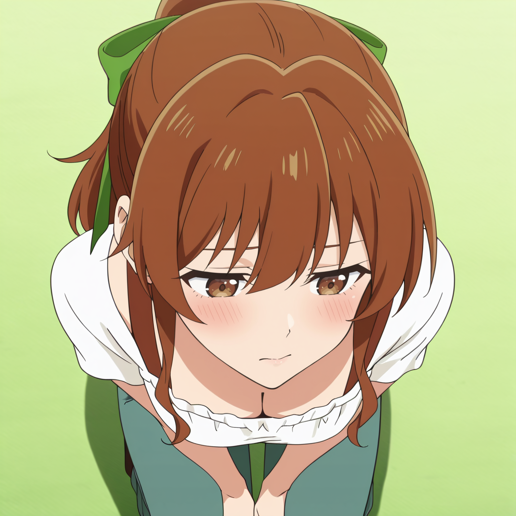 WMNina, brown eyes, brown hair, long hair, green hair ribbon, ponytail, sidelocks,