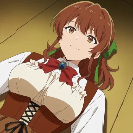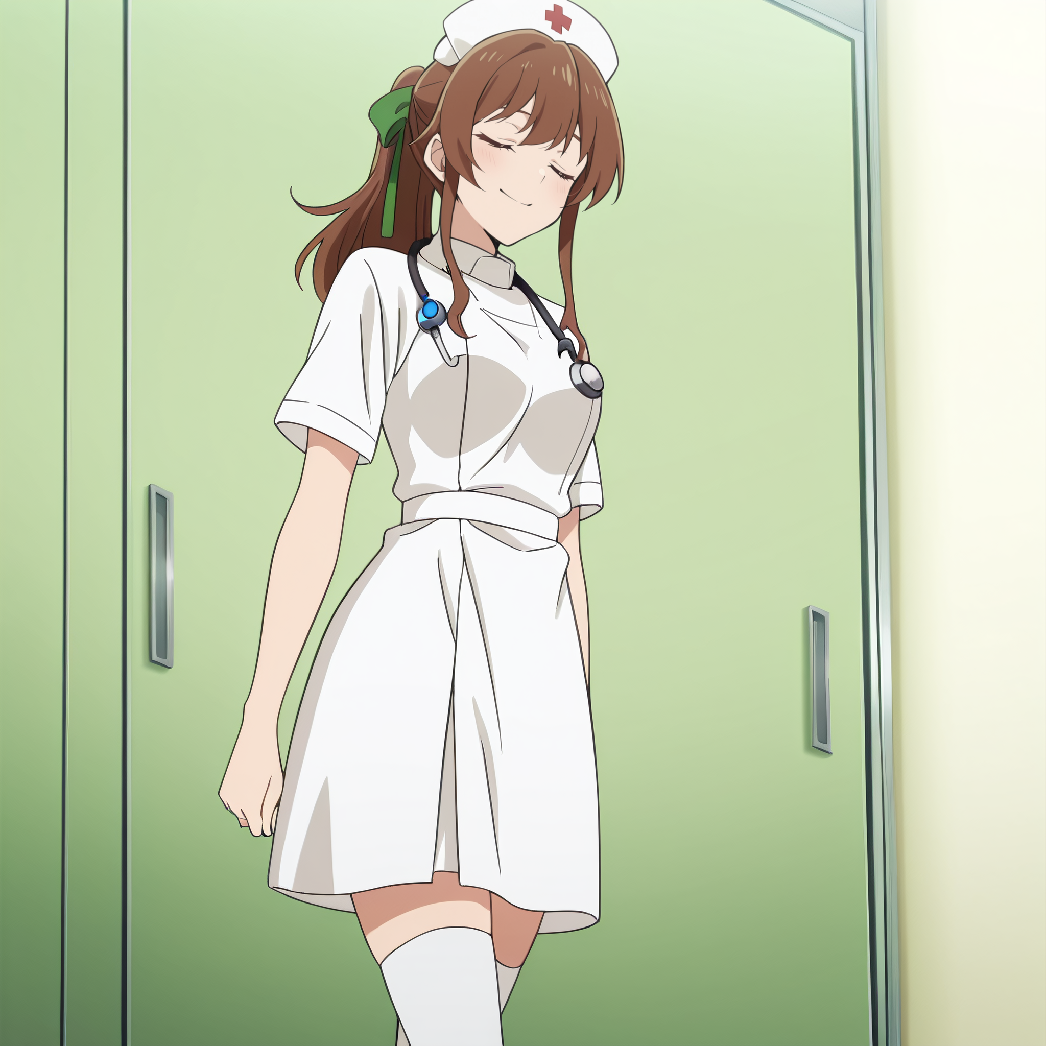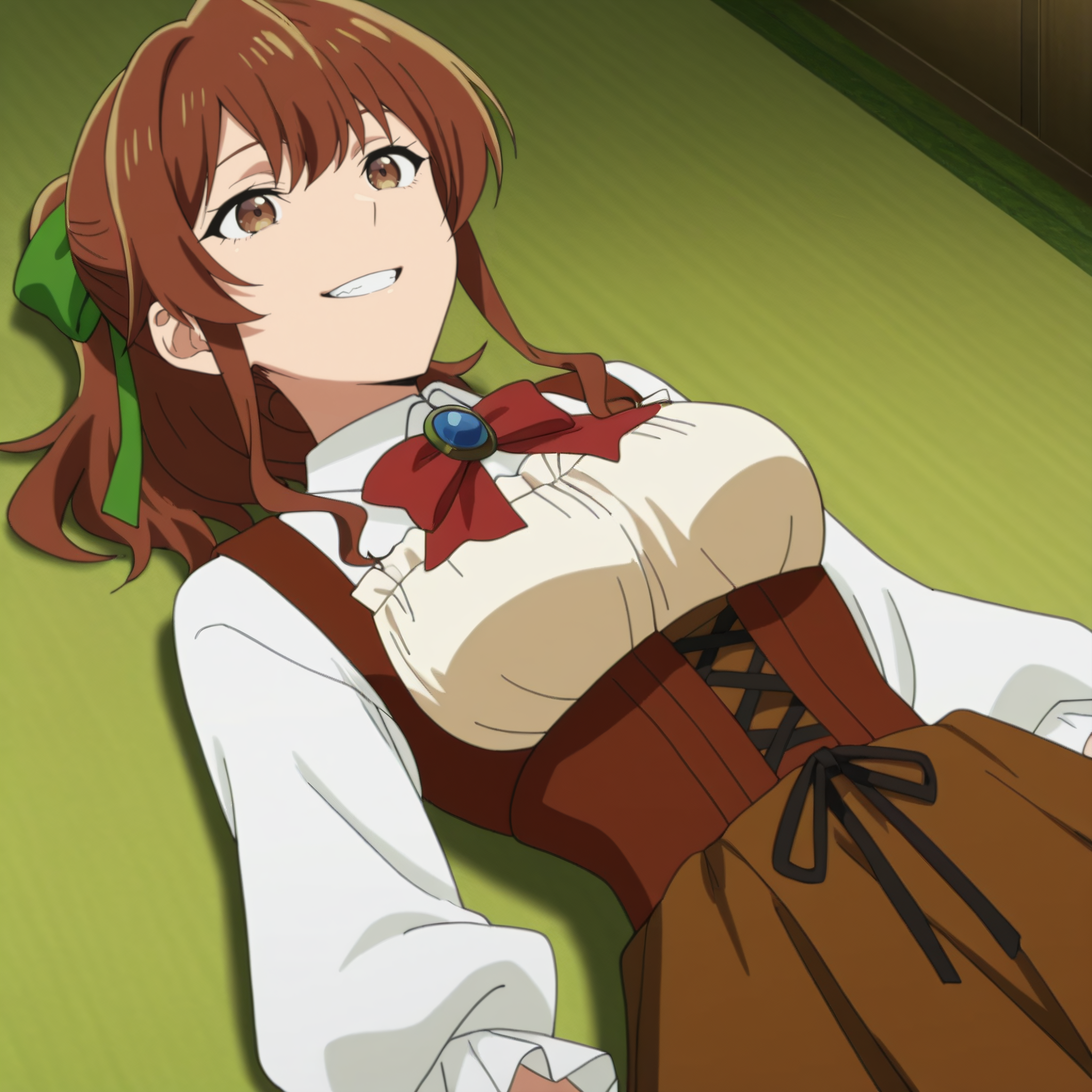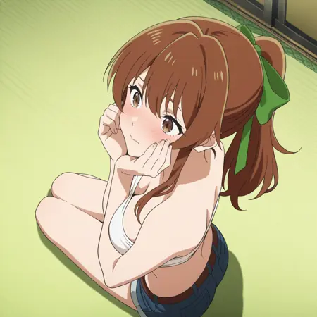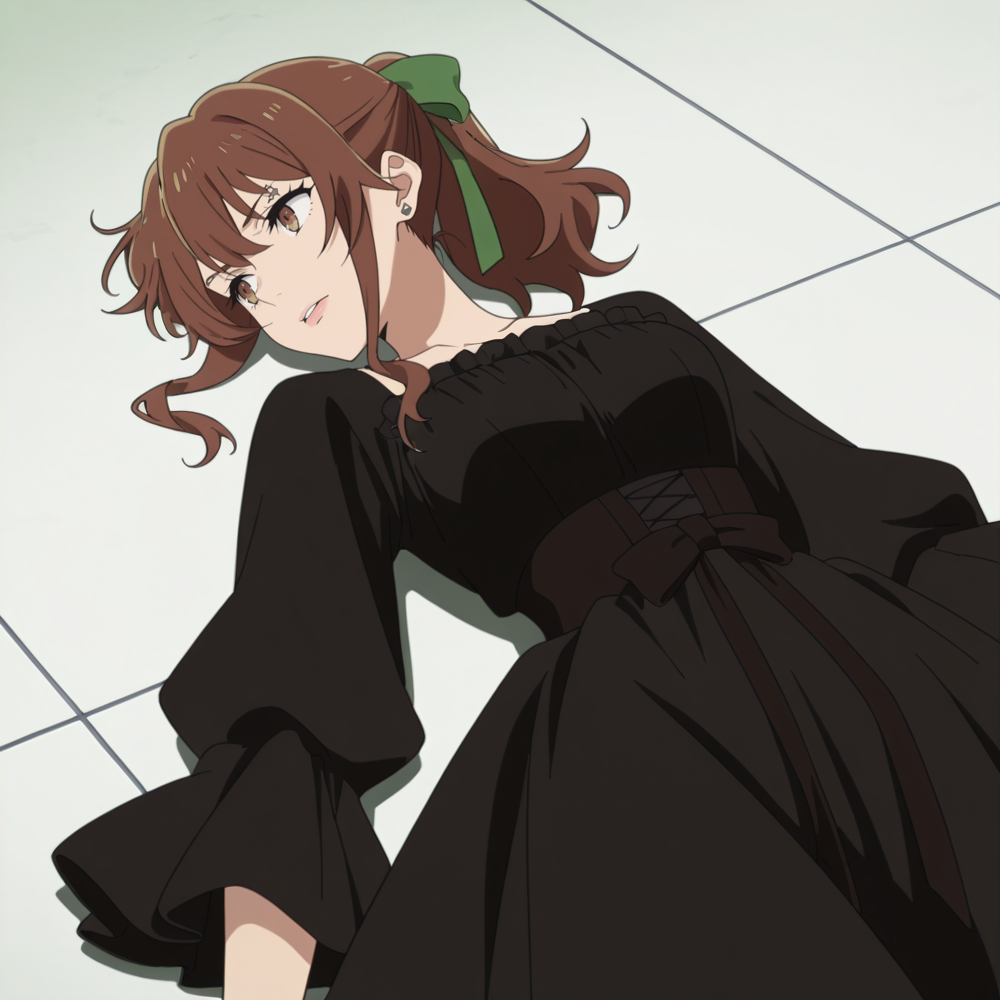WMNina, brown eyes, brown hair, long hair, green hair ribbon, ponytail, sidelocks,