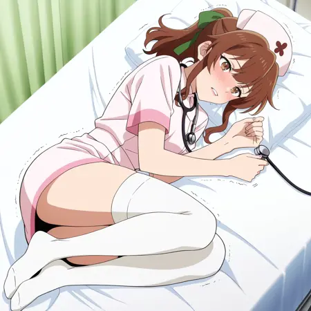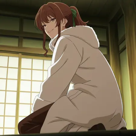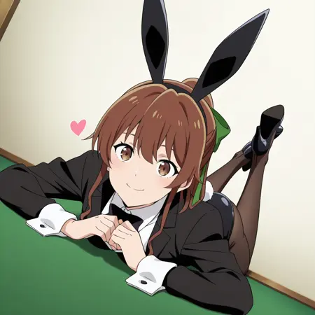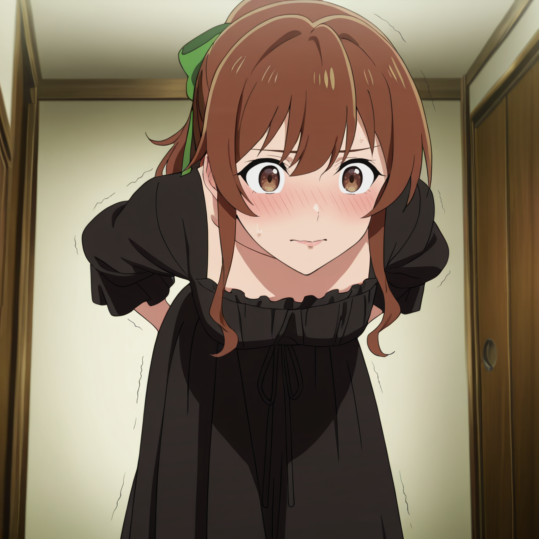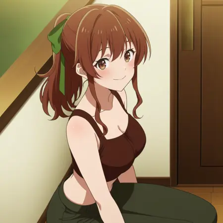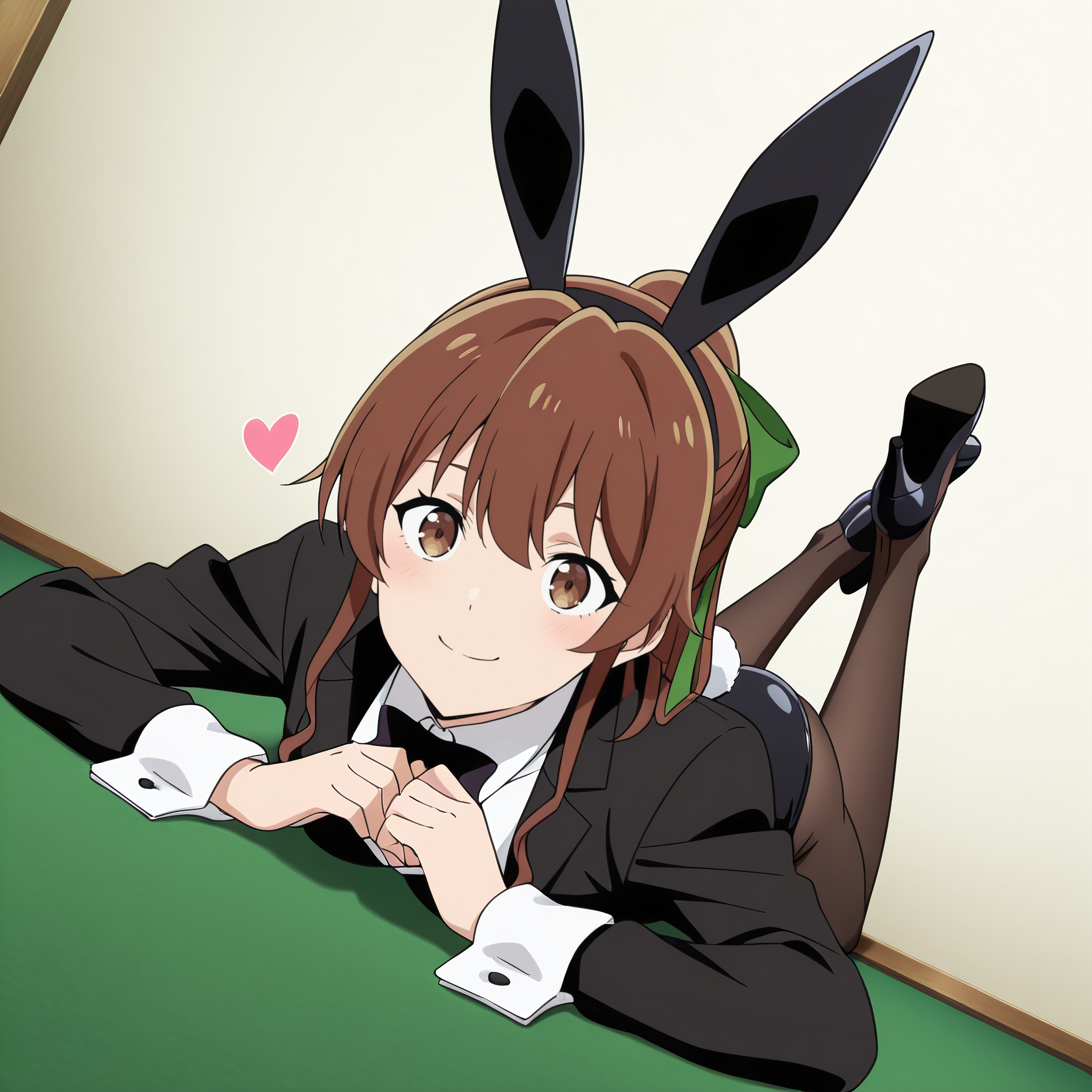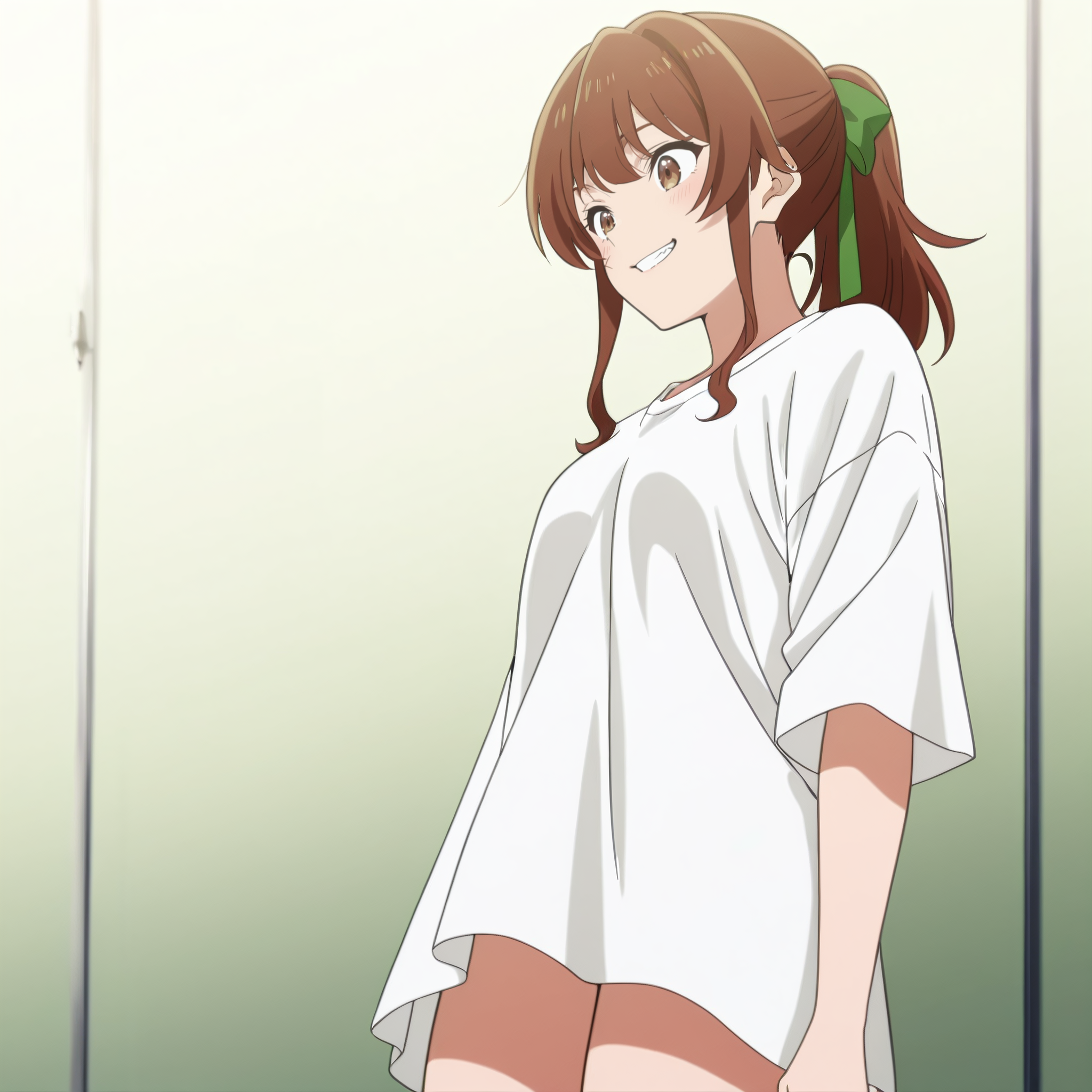 WMNina, brown eyes, brown hair, long hair, green hair ribbon, ponytail, sidelocks,