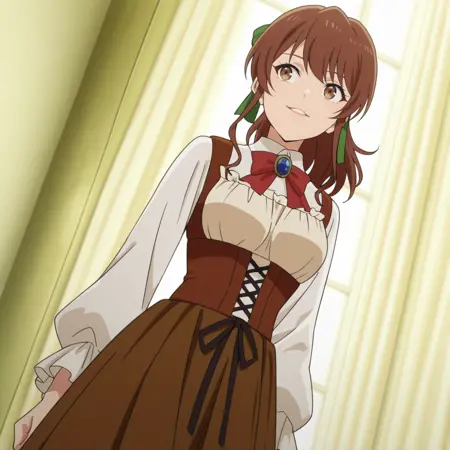 흰색 셔츠, 빨간 리본 넥타이, 목-collar 셔츠, 갈색 드레스, 보석, 브로치, 갈색 치마, 코르셋, 긴 소매, 아랫가슴,